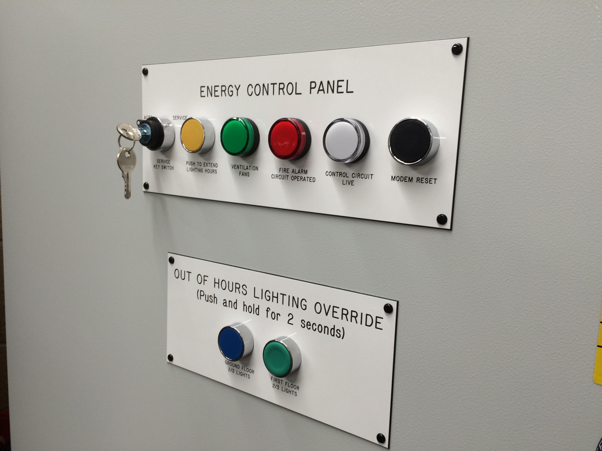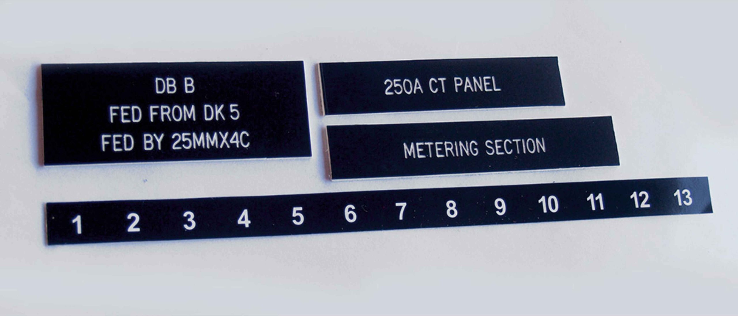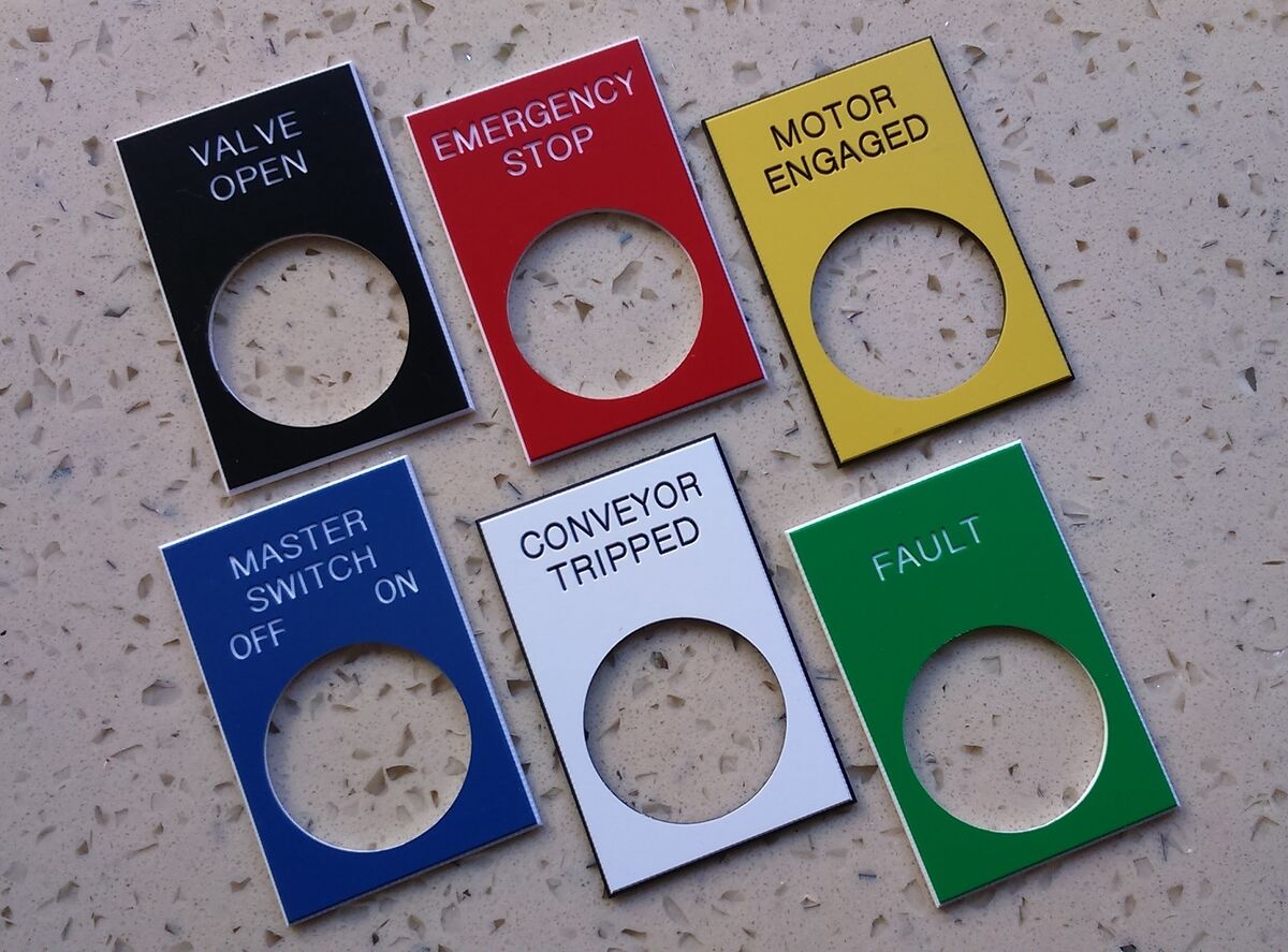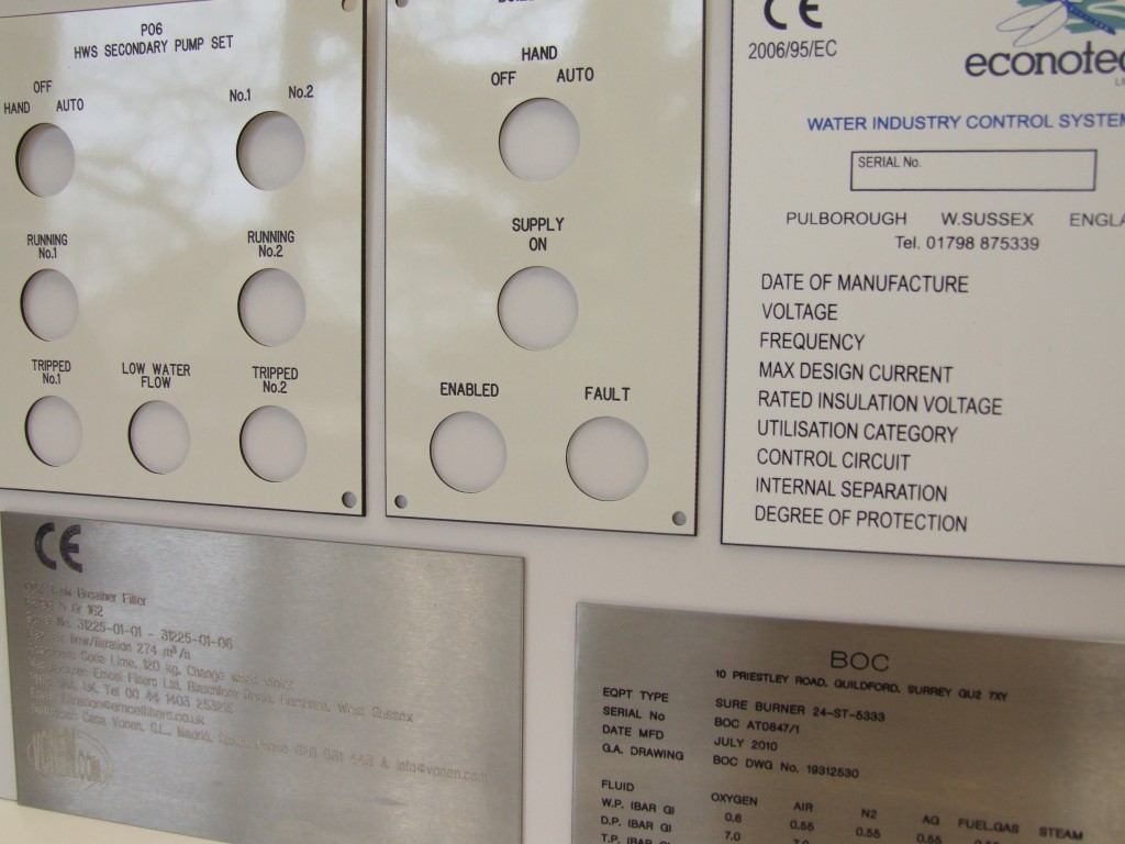 Produced from your CAD drawing, we can engrave into trafolyte material or alternatively stainless steel. Each panel can have cutouts for switches / lamps as needed.