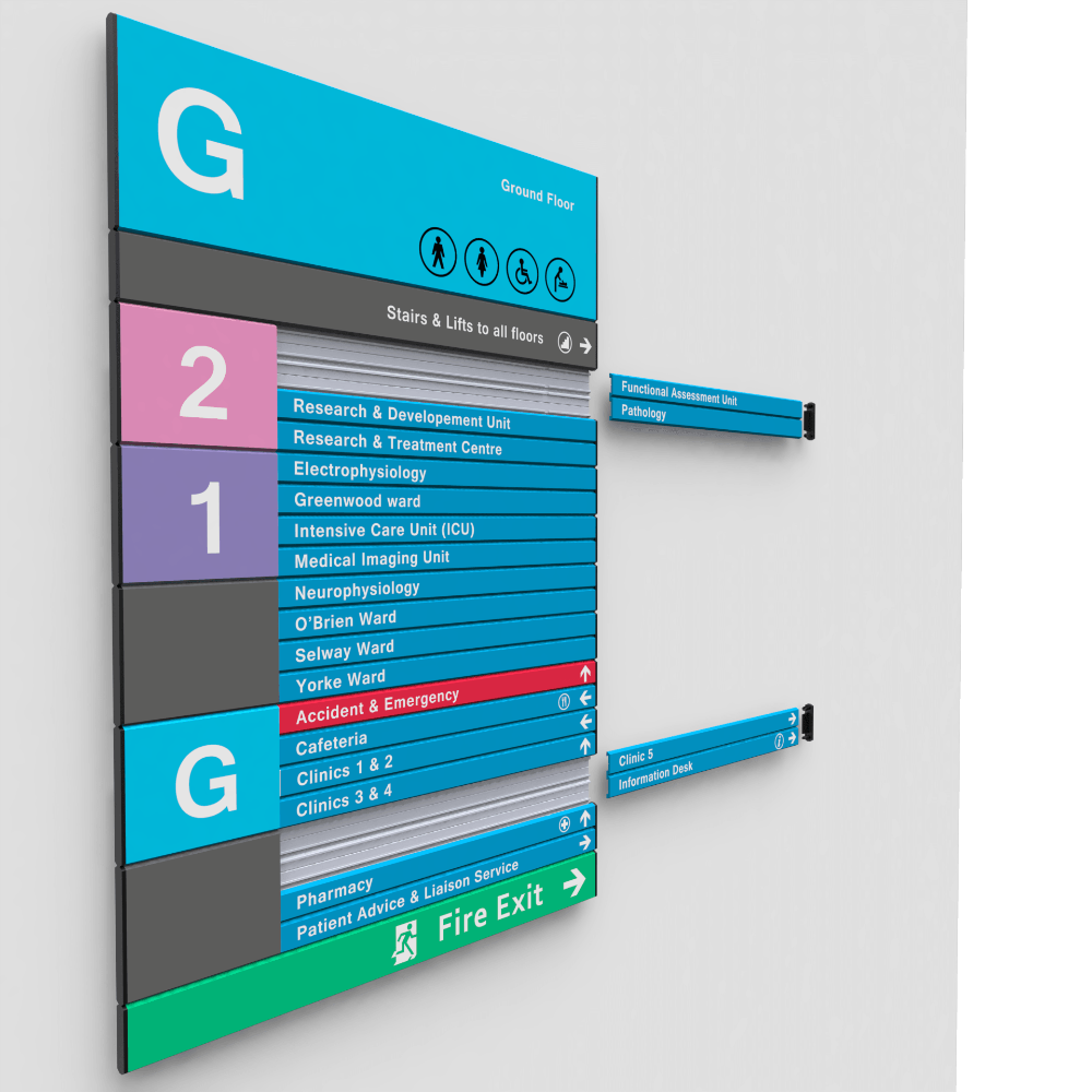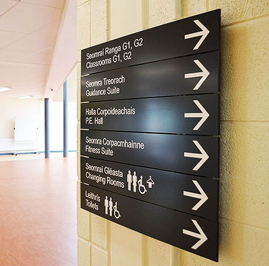 With over 40 years of experience, our team can help design a comprehensive Wayfinding solution to enhance your facility. We consider a range of factors such as the environment e.g. a hospital will need symbols & clear instruction to allow patrons navigate an unfamiliar and complex space; legibility, these signs should be easily readable from a distance with clear fonts and contrasting colours; continuity of signage elements and consistency is also a critical element when creating your Directional Signage programme.